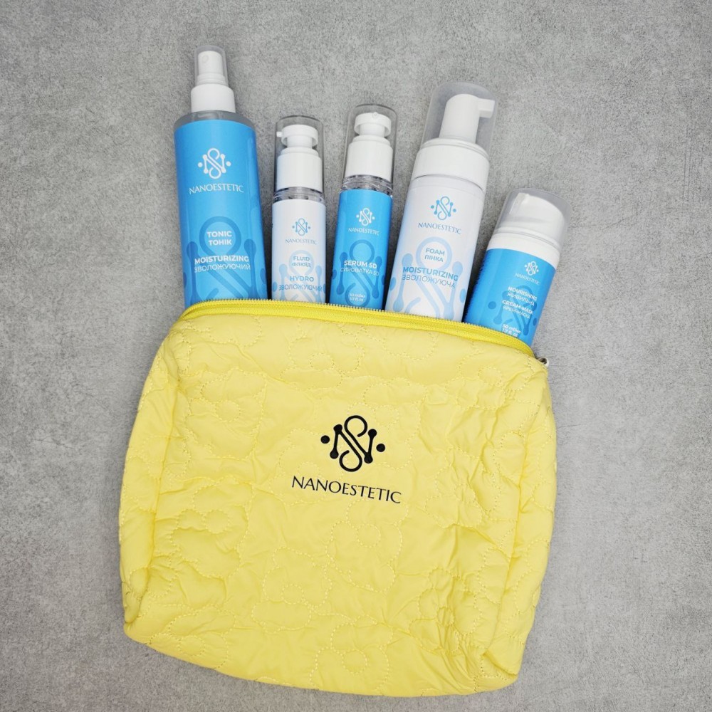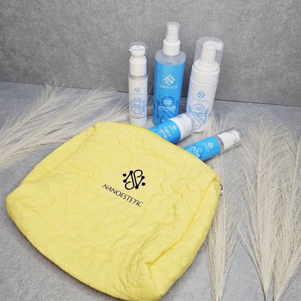 До набору додається фірмова косметичка NANOESTETIC — зручна для зберігання засобів вдома або в подорожах.
